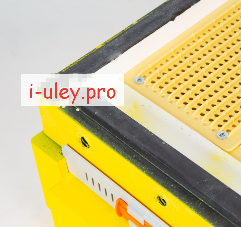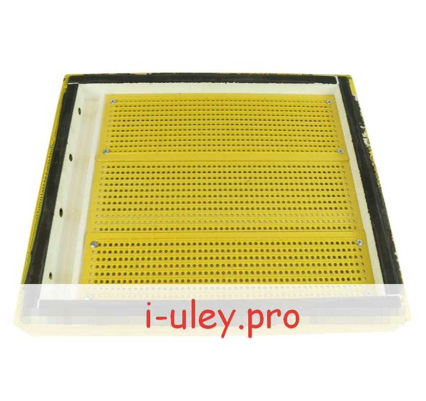 Сверху и снизу по периметру установлены пластиковые вставки, увеличивающие прочность и долговечность пыльцесборника. В углах эти вставки усилены и выполнены с небольшим изгибом для отделения элементов улья друг от друга стамеской.
