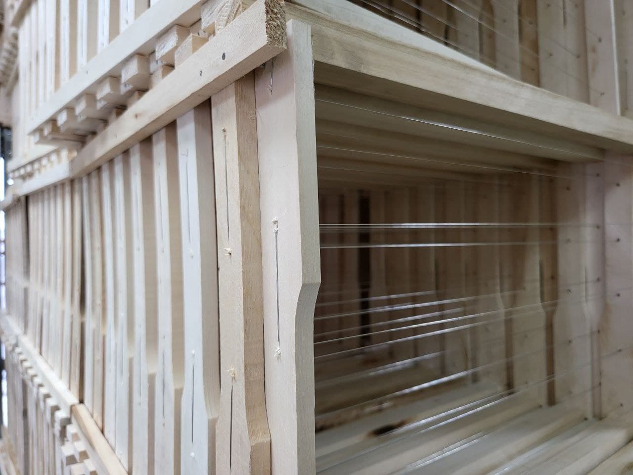 Материалы и элементы, используемые при изготовлении товара: рамка поставляется в собранном виде. Состоит из верхнего и нижнего брусков, а также двух боковых планок, изготовленные из липы. Рамка скреплена гвоздями для рамок и имеет натянутую проволоку из нержавейки.