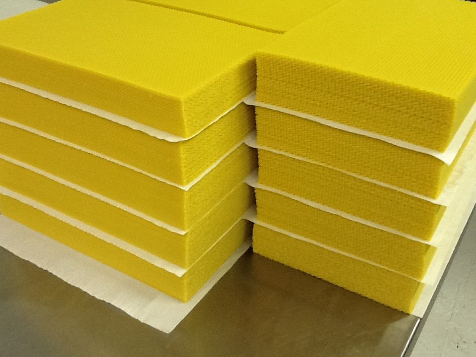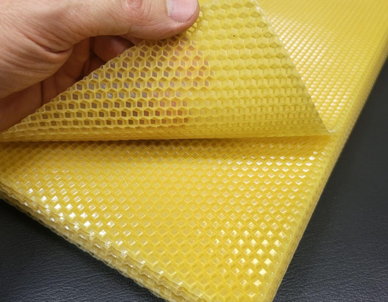 Несмотря на высокое содержание воска (100%), листы не коробятся, не вытягиваются, не рвутся при постановке в рамку. Вощина пружинит, но не ломается — результат правильной технологии.