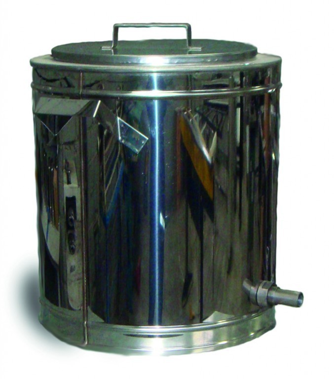 Воскотопка состоит из двухстенного бака с крышкой, сточного патрубка и корзины с отверстиями для загрузки 3 кг вырезанных из рамок сотов.Вся воскотопка сделана из нержавеющей пищевой стали.В межстенное пространство через патрубок заливают воду. Время переработки одной партии 45-60 мин, восковитость вытопок 43-44%. Выход воска в расчете на гнездовую ульевую рамку размерами 475*300 мм = 110 гр.