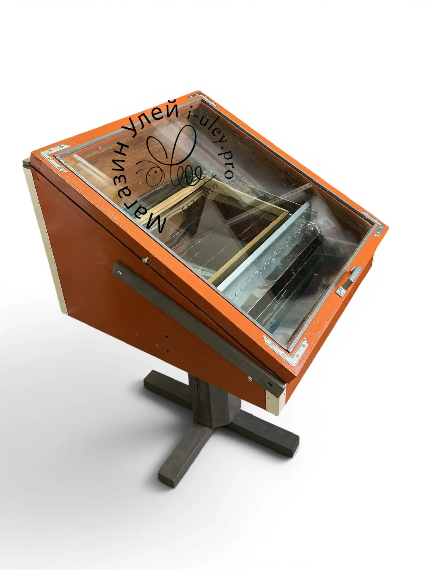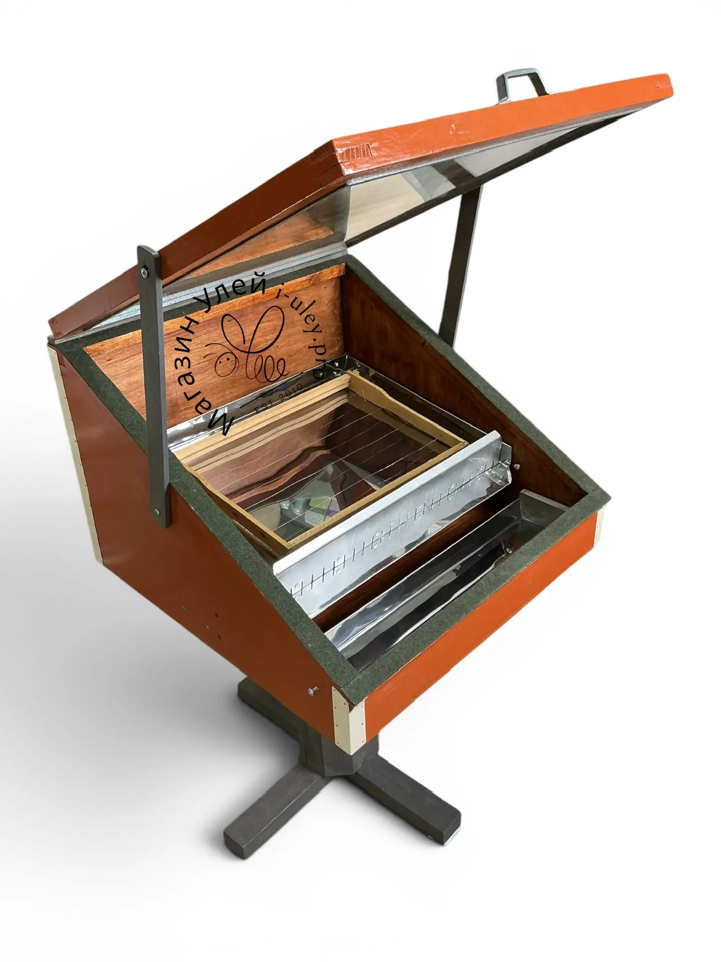 Воскотопка установлена на поворотной подставке, что позволяет поворачивать её стеклом к солнцу в течение дня . Это максимально увеличивает эффективность работы и сокращает время перетопки. Высота подставки 55 см обеспечивает удобную работу без наклонов.